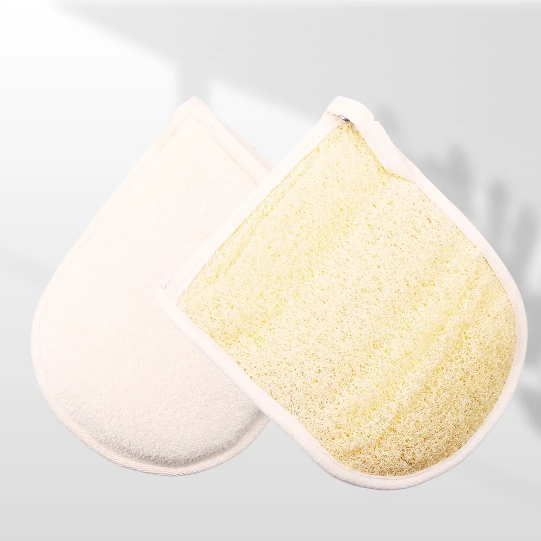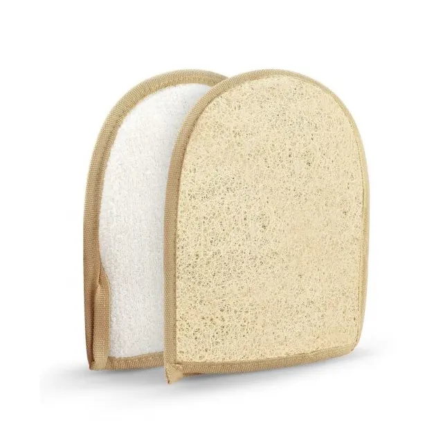 Innovative design combines 100% natural loofah on the front surface for deep exfoliation with a soft 100% cotton towel backing for gentle cleansing and drying. This hybrid approach offers versatility that single-material products cannot match, giving end users two bath accessories in one.